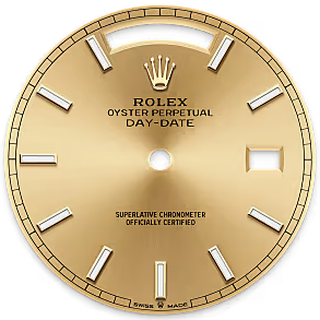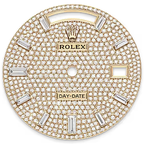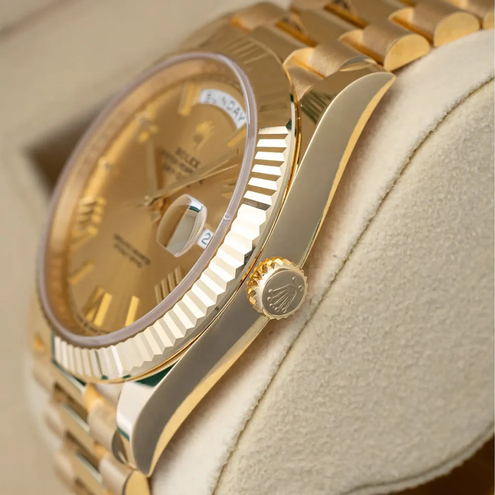 It was therefore identical to the fluting on the case back, which was also screwed onto the case for waterproofness, using specific Rolex tools. Over time, the fluting became an aesthetic element, a genuine Rolex signature feature. Today the fluted bezel is a mark of distinction, in gold on this Day-Date 40.