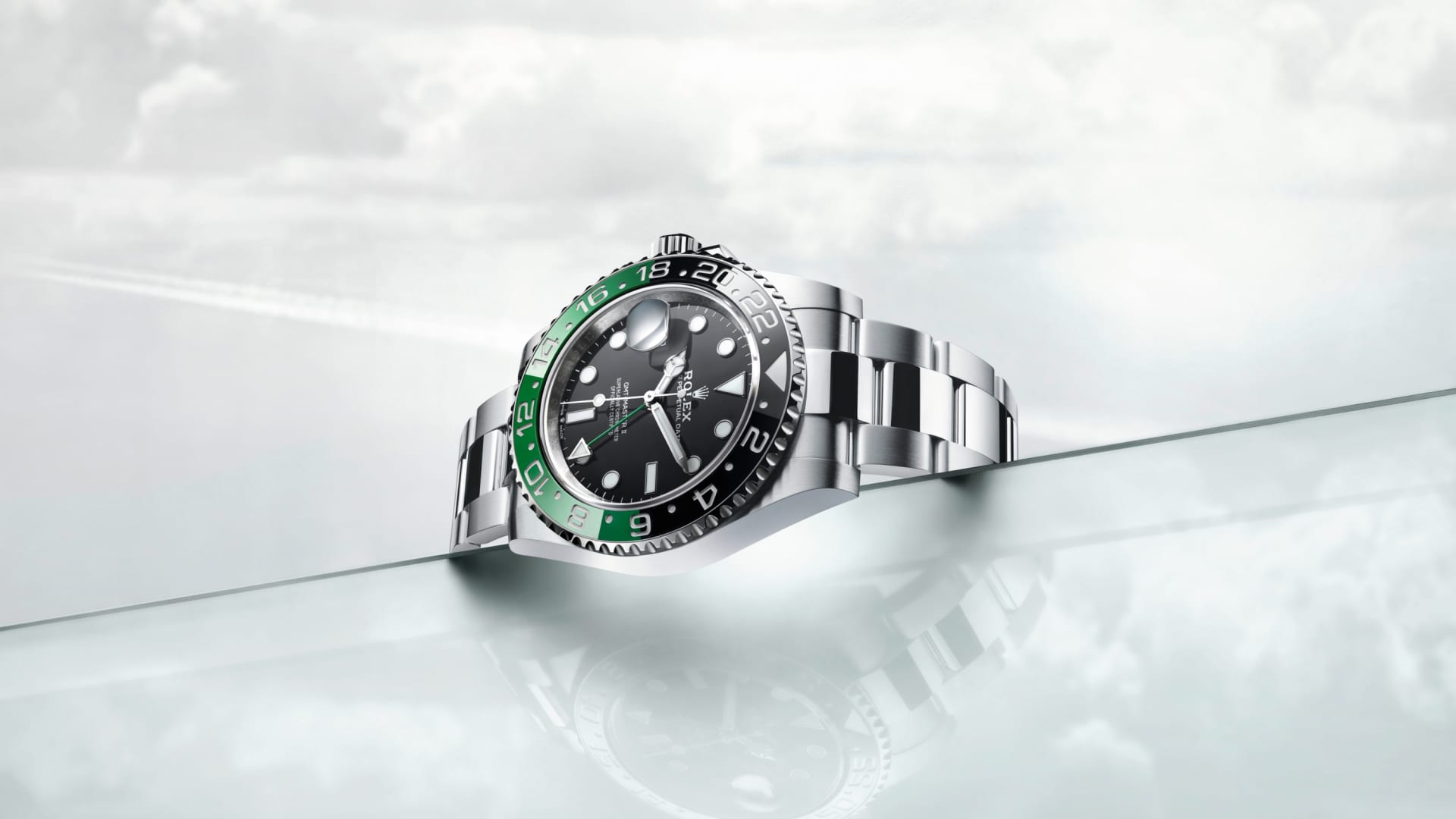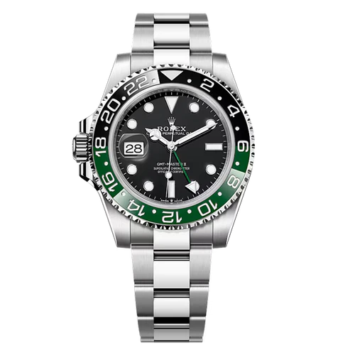 This model features a black dial and a two-colour Cerachrom bezel insert in green and black ceramic. In addition to conventional hour, minute and seconds hands, the GMT-Master II features an arrow-tipped hand, which circles the dial once every 24 hours, as well as a bidirectional rotatable 24-hour graduated bezel.